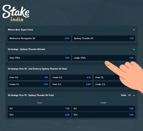 Stake offers the opportunity to place bets not only on traditional outcomes but also on special betting markets. For example, you can bet on the number of runs, which team will take the first wicket in cricket, and much more. The larger the specific match, the more betting markets will be available to you.